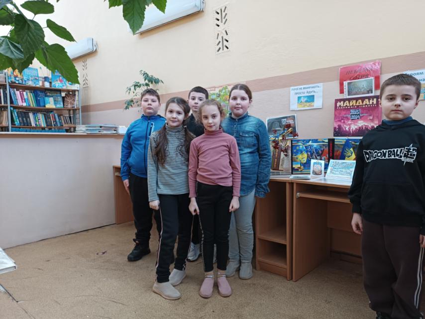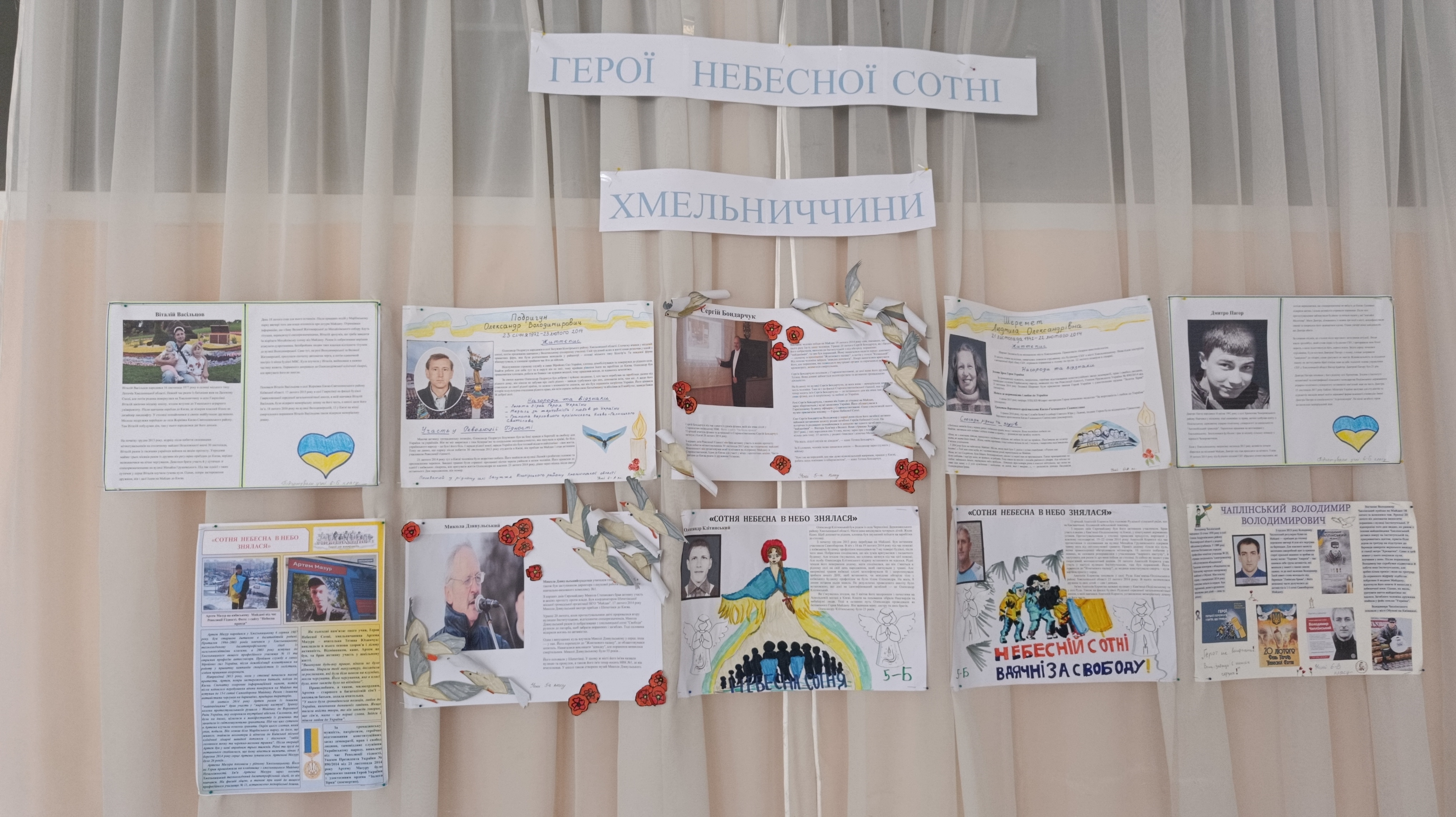 Окрему увагу приділили і подвигу земляків: учні 5-6 класів підготували експозицію постерів «Сотня Небесна в небо знялася», присвячену Героям Небесної Сотні Хмельниччини.