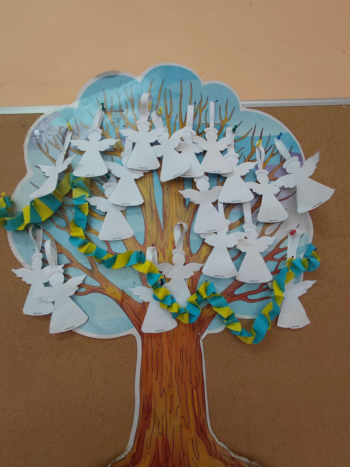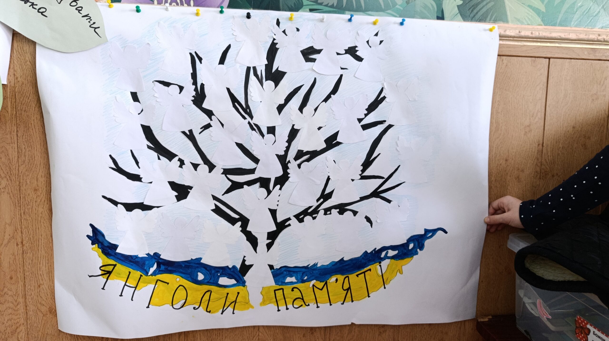 Естафету пам’яті підхопили учні третіх-четвертих класів, які виготовили зворушливу композицію – дерево «Ангели пам’яті», що символізує душі, які навіки пішли у небо за нашу свободу.