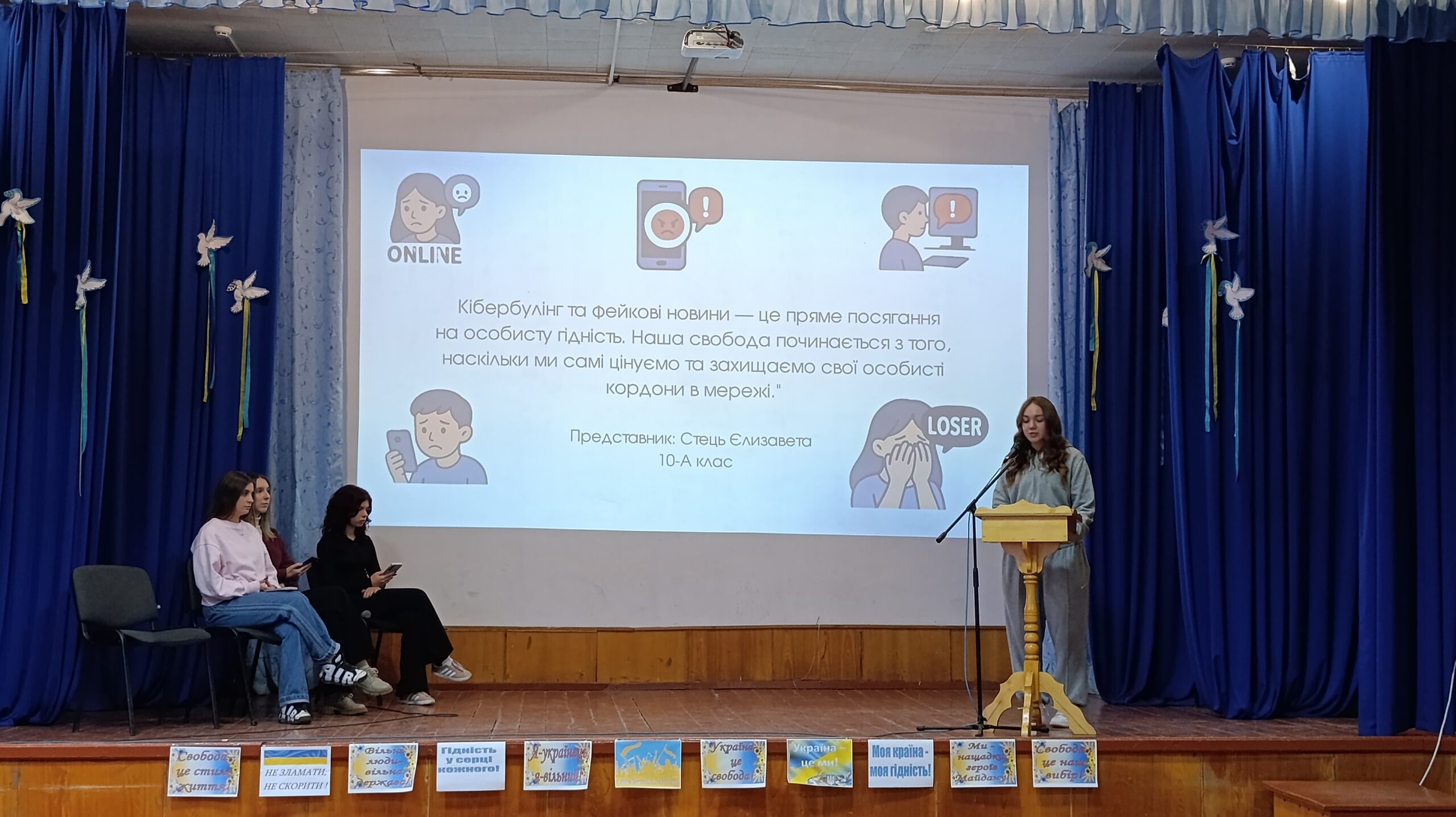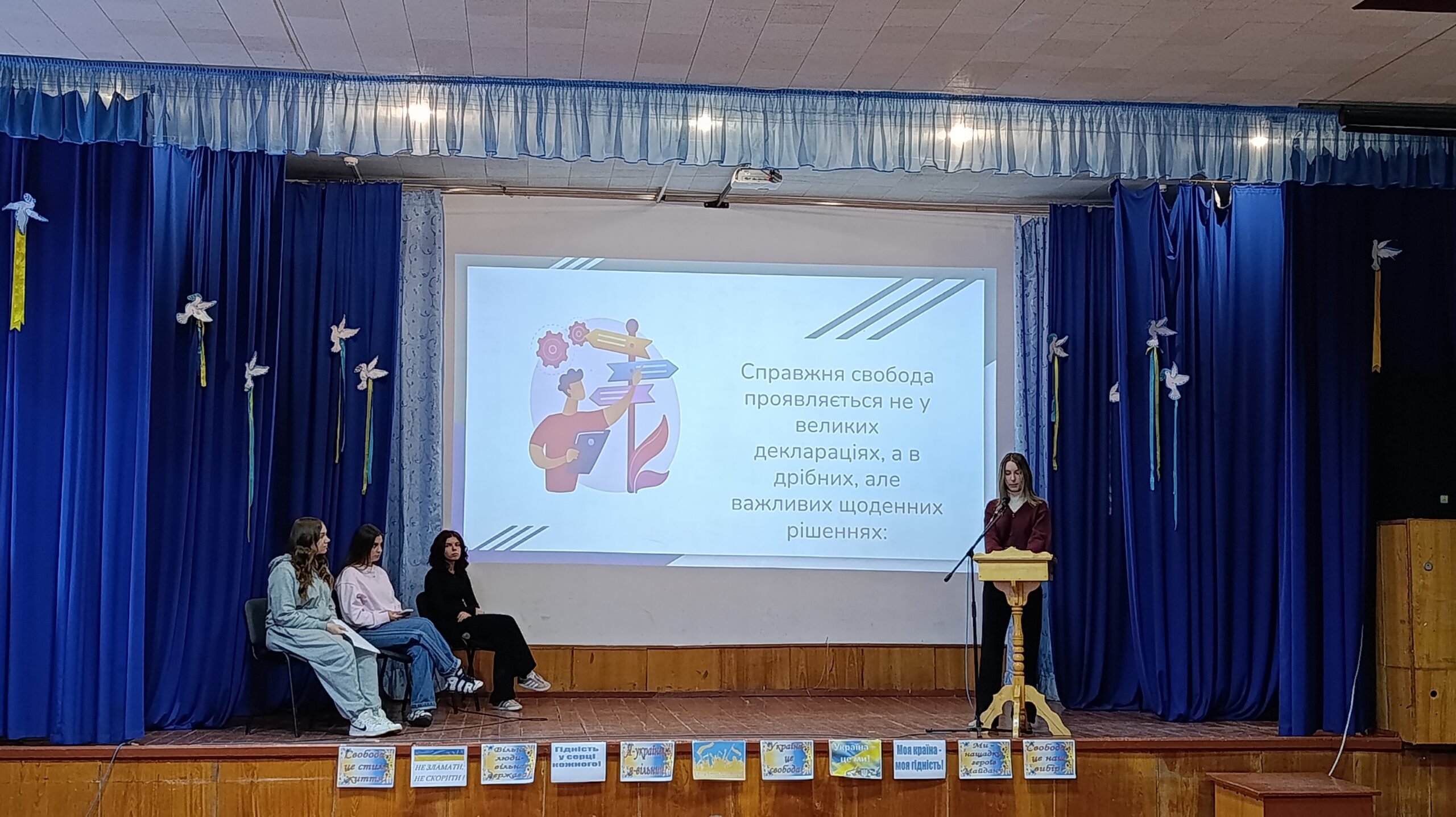 Центральною частиною заходу стала робота учнівської дискусійної групи, до якої увійшли спікери, делеговані від своїх класів. Вони представили підготовлені тези, які охопили як особистісний, так і національний вимір понять гідності та свободи.
