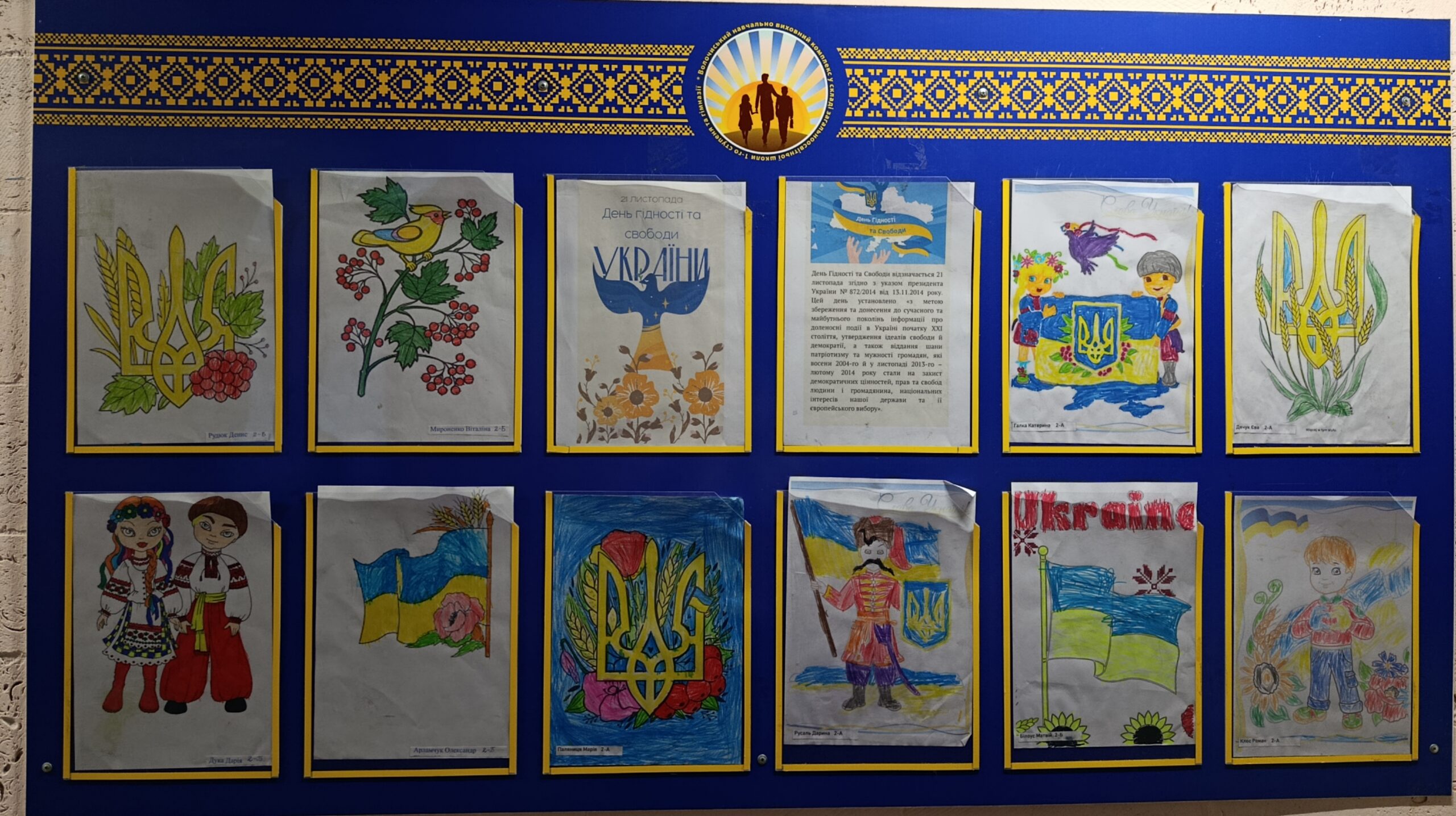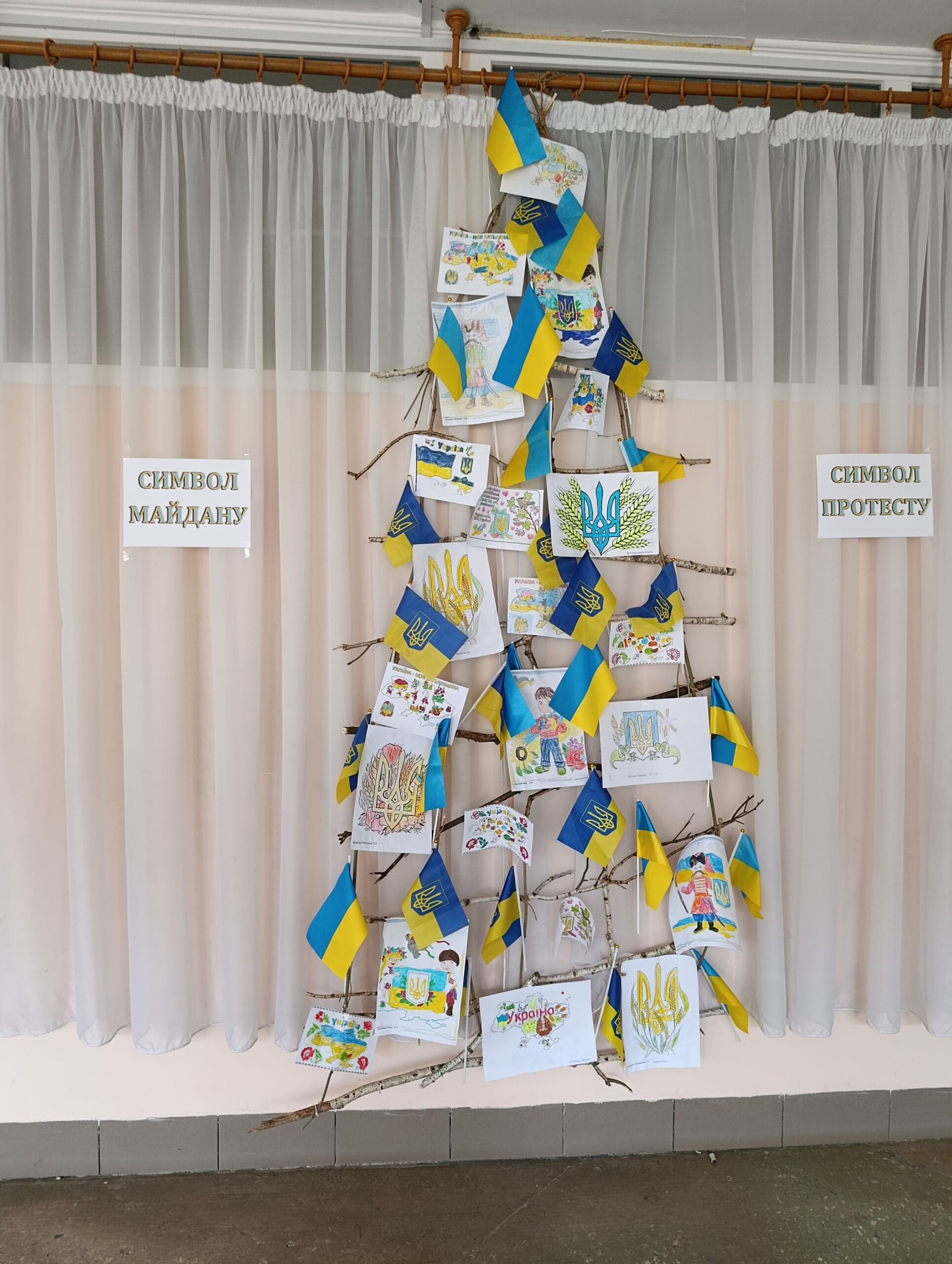 Частина малюнків була розміщена на загальношкільній виставці. Інша частина робіт була на ялинці, що символізує Майдан та протестний рух.
